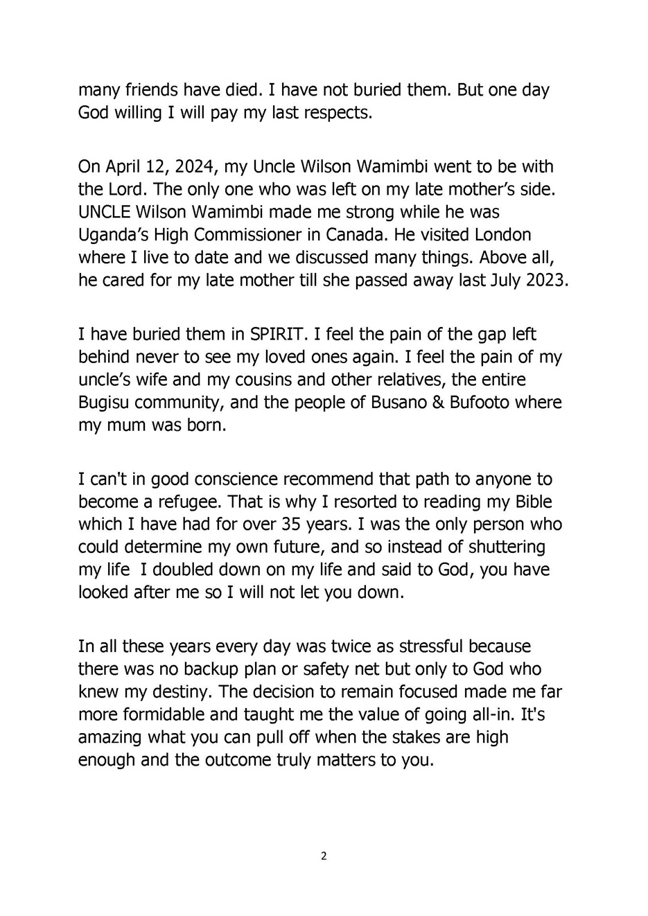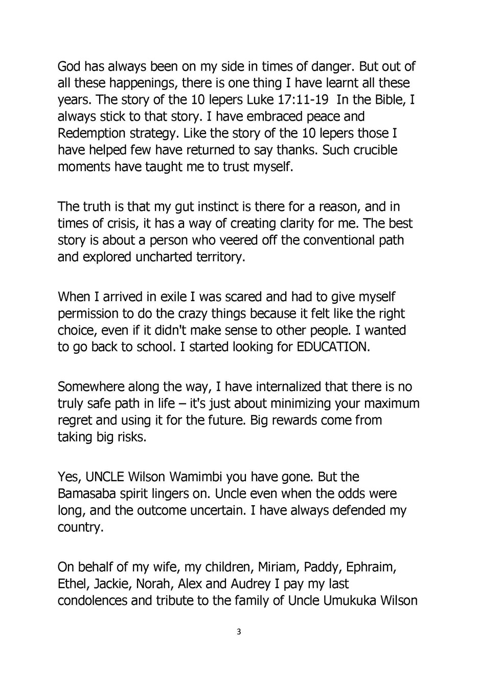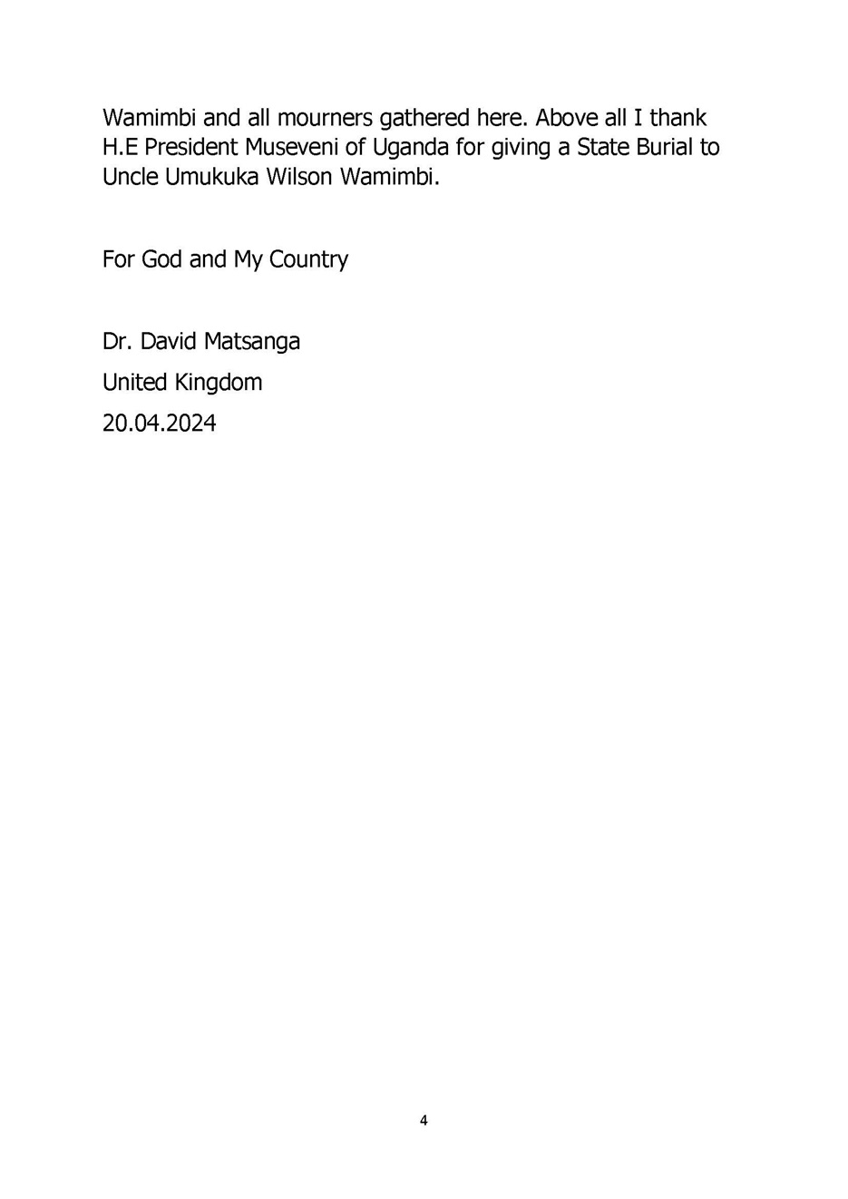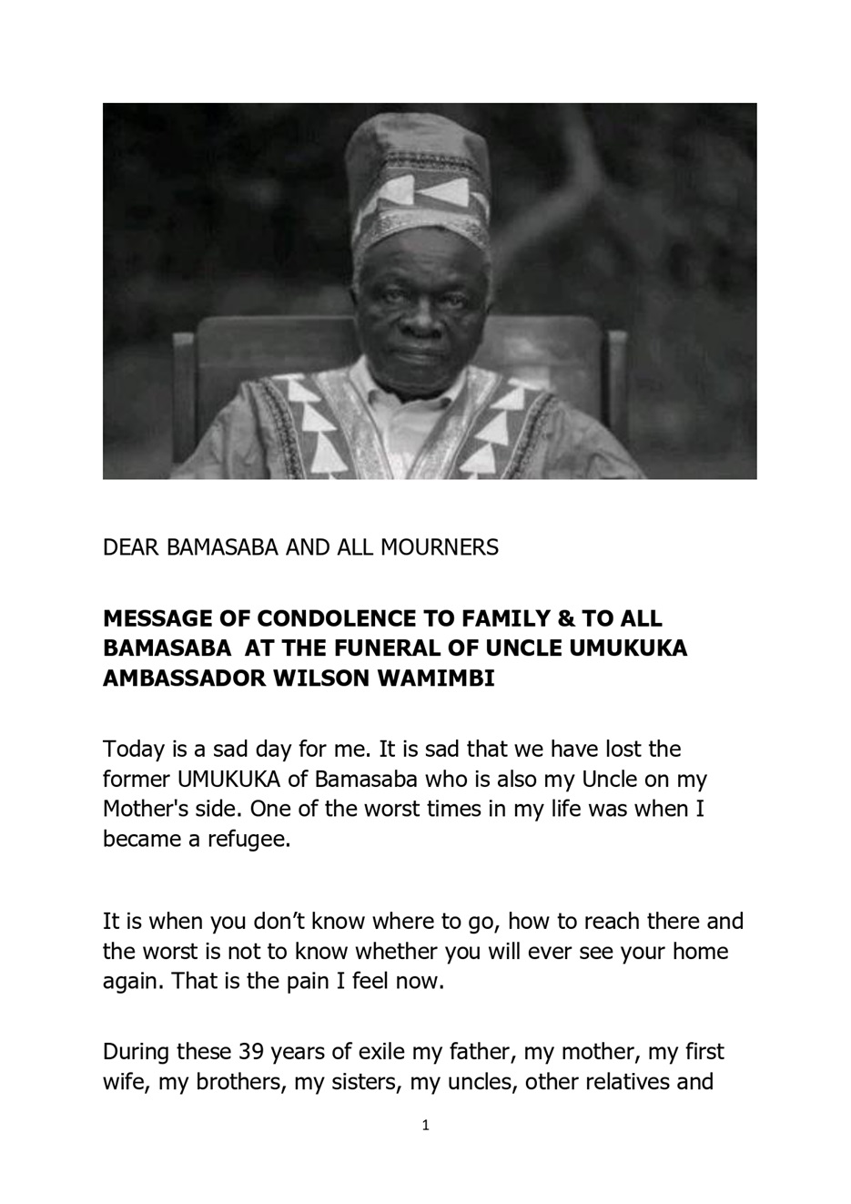 1904MESSAGE OF CONDOLENCE TO FAMILY & TO ALL BAMASABA AT THE FUNERAL OF UNCLE UMUKUKA AMBASSADOR WILSON WAMIMBI